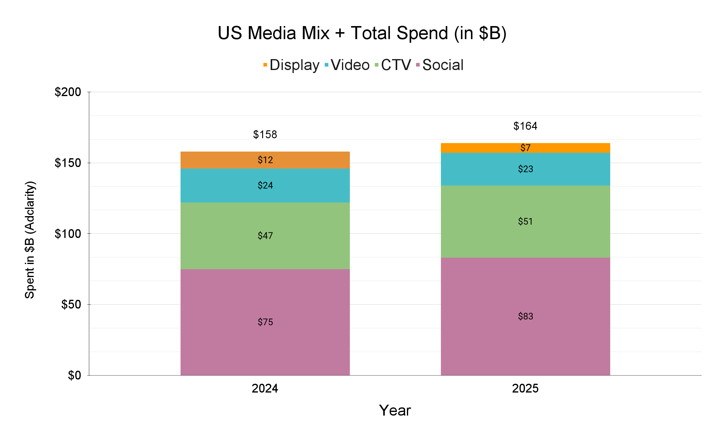 As we look back at 2025 from the start of 2026, our proprietary data shows a US digital ad market that grew modestly in total, but shifted sharply in how budgets were allocated. Across social, display, online video, and Connected TV, spend reached about 164.3 billion dollars in 2025, up roughly 4 percent from 157.9 billion dollars in 2024. The headline: social and CTV are doing the heavy lifting while display and video lose ground.